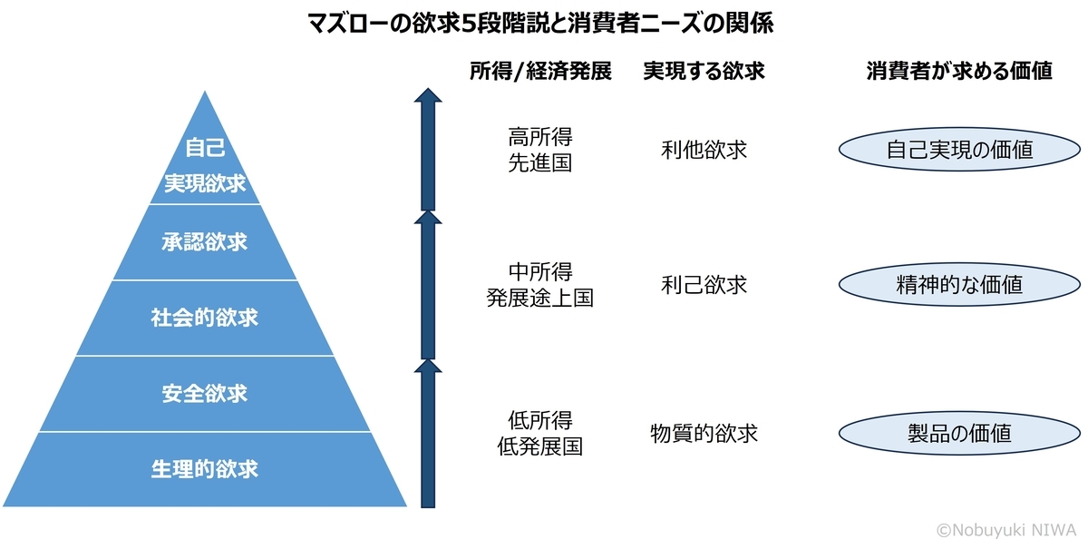 1990年代以降、消費者ニーズが劇的に変化しました。その変化は、フィリップ・コトラーがマーケティング1.0から4.0で提唱しているよう物理的な製品価値から精神的価値、そして自己実現の価値へと進化する流れを辿っています。そして、この変化はアブラハム・マズローの欲求5段階説にも整合性がみられます。