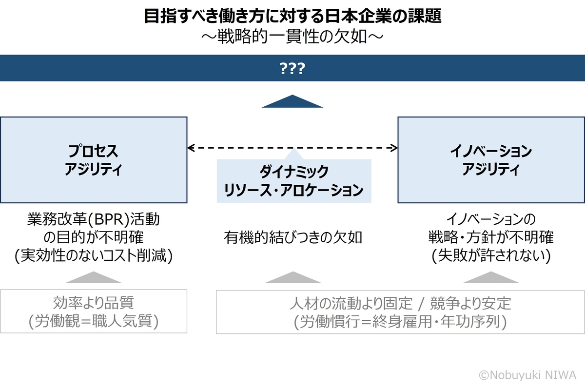 一方、多くの日本企業ではその一貫性がなく、失敗が許されない文化のもと、イノベーションの戦略・方針が不明確であったり、業務改革自体が実効性のないコスト削減に終始したりなど、明確な目的がなく、イノベーション・アジリティとプロセス・アジリティの有機的な結びつきが不十分です。